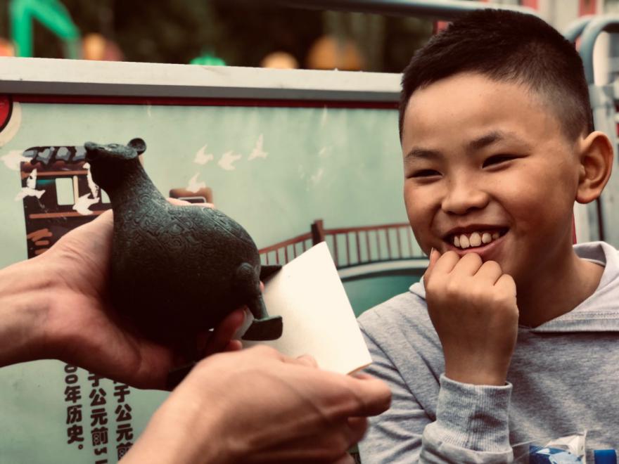 (學(xué)生興奮地聽著志愿服務(wù)人員手持文物復(fù)制品進行的文物知識普及)